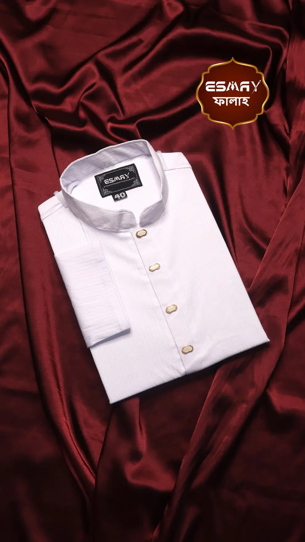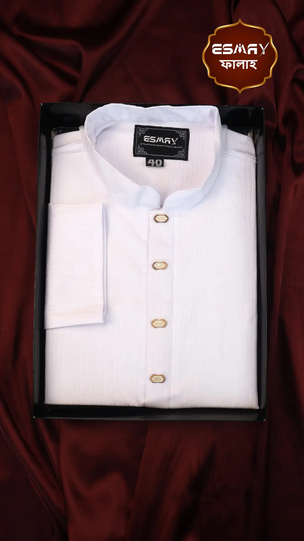 Buy ESMAY premium textured cotton panjabi in elegant white. Featuring breathable luxury fabric, gold-framed stone buttons, and a smart band collar—perfect for Eid, Jummah, and special occasions.